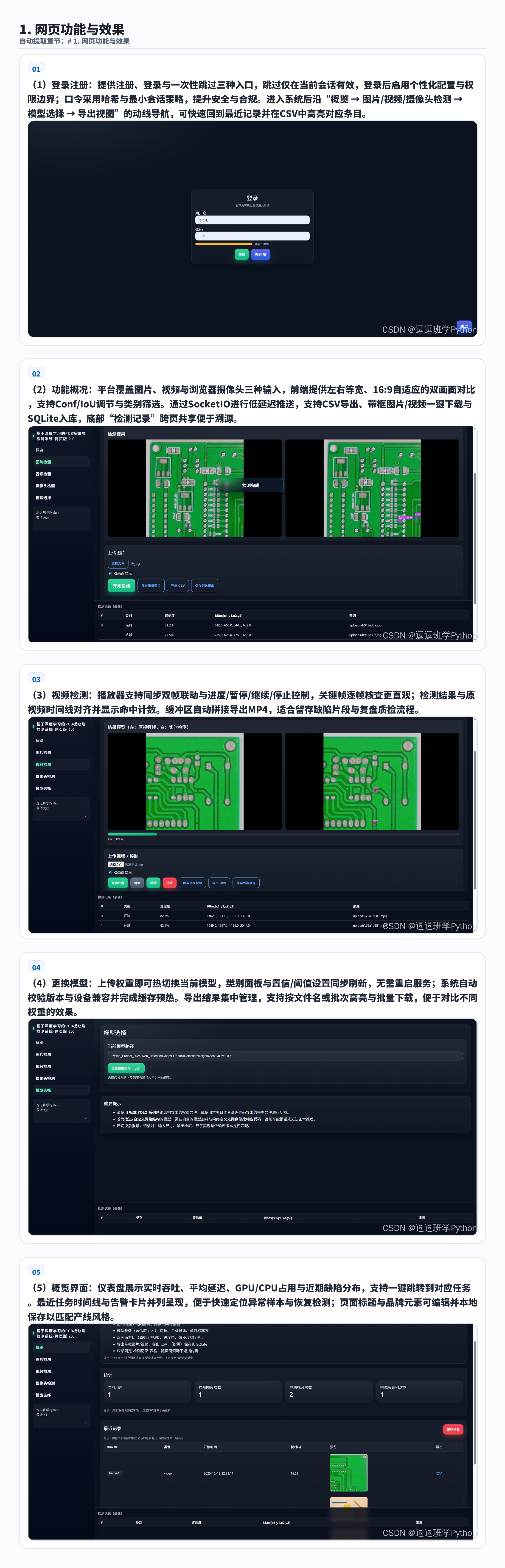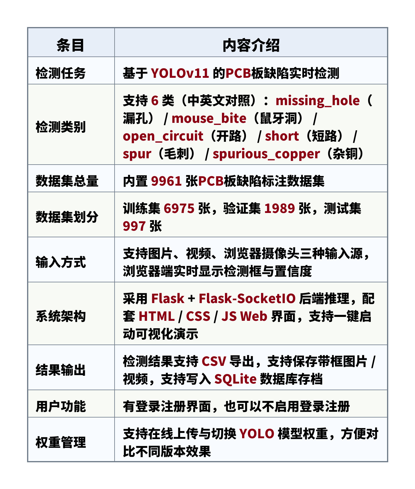 检测类别:支持 6 类(中英文对照):missing_hole(漏孔) / mouse_bite(鼠牙洞) / open_circuit(开路) / short(短路) / spur(毛刺) / spurious_copper(杂铜)