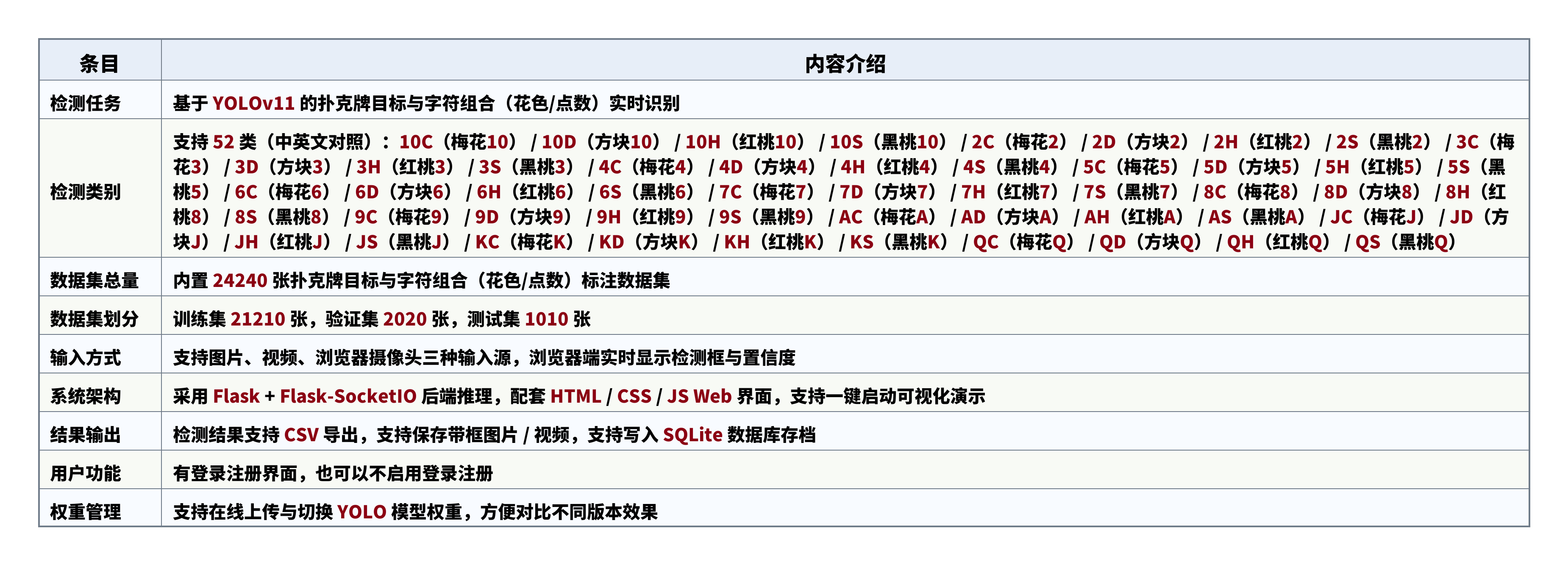 检测类别:支持 52 类(中英文对照):10C(梅花10) / 10D(方块10) / 10H(红桃10) / 10S(黑桃10) / 2C(梅花2) / 2D(方块2) / 2H(红桃2) / 2S(黑桃2) / 3C(梅花3) / 3D(方块3) / 3H(红桃3) / 3S(黑桃3) / 4C(梅花4) / 4D(方块4) / 4H(红桃4) / 4S(黑桃4) / 5C(梅花5) / 5D(方块5) / 5H(红桃5) / 5S(黑桃5) / 6C(梅花6) / 6D(方块6) / 6H(红桃6) / 6S(黑桃6) / 7C(梅花7) / 7D(方块7) / 7H(红桃7) / 7S(黑桃7) / 8C(梅花8) / 8D(方块8) / 8H(红桃8) / 8S(黑桃8) / 9C(梅花9) / 9D(方块9) / 9H(红桃9) / 9S(黑桃9) / AC(梅花A) / AD(方块A) / AH(红桃A) / AS(黑桃A) / JC(梅花J) / JD(方块J) / JH(红桃J) / JS(黑桃J) / KC(梅花K) / KD(方块K) / KH(红桃K) / KS(黑桃K) / QC(梅花Q) / QD(方块Q) / QH(红桃Q) / QS(黑桃Q)