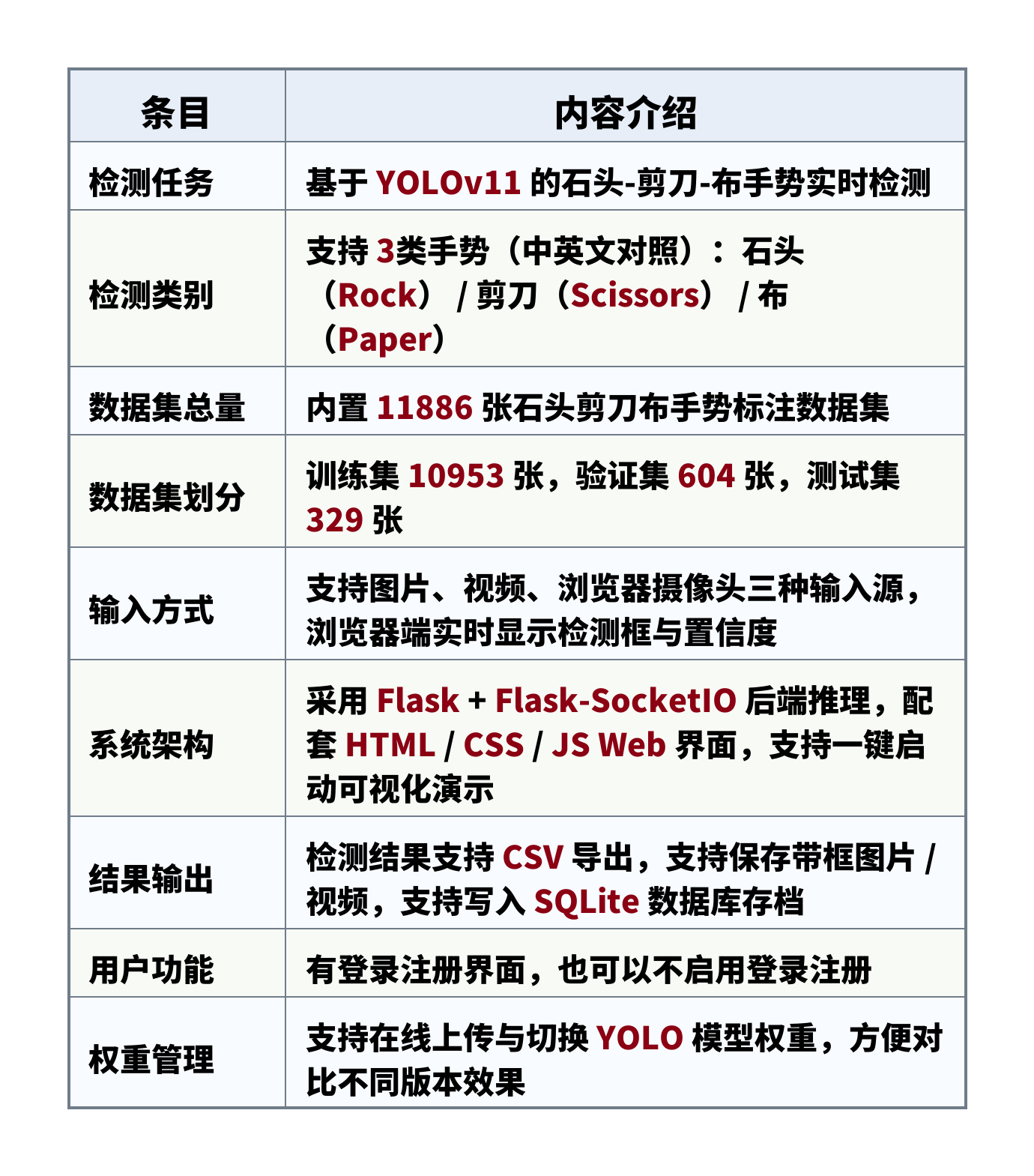 检测类别:支持 3类手势(中英文对照):石头(Rock) / 剪刀(Scissors) / 布(Paper)
