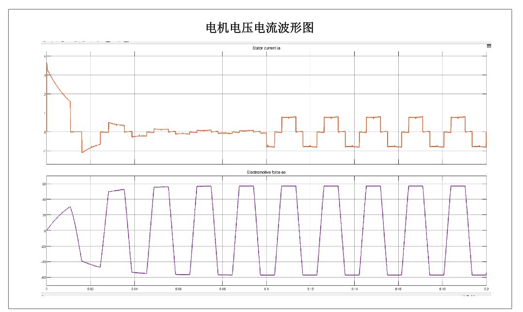 由图可以看出:电机转速在模糊PID控制策略下转速平滑且快速达到稳定的状态,且电机在0.1时增加负载,抗干扰能力很强,几乎没有转速下降,且反电动势和电流波形更加平滑,由此可见模糊控制BLDCM达到了预期的效果,具有较好的控制电机的性能,并具有较好的动静稳定性。