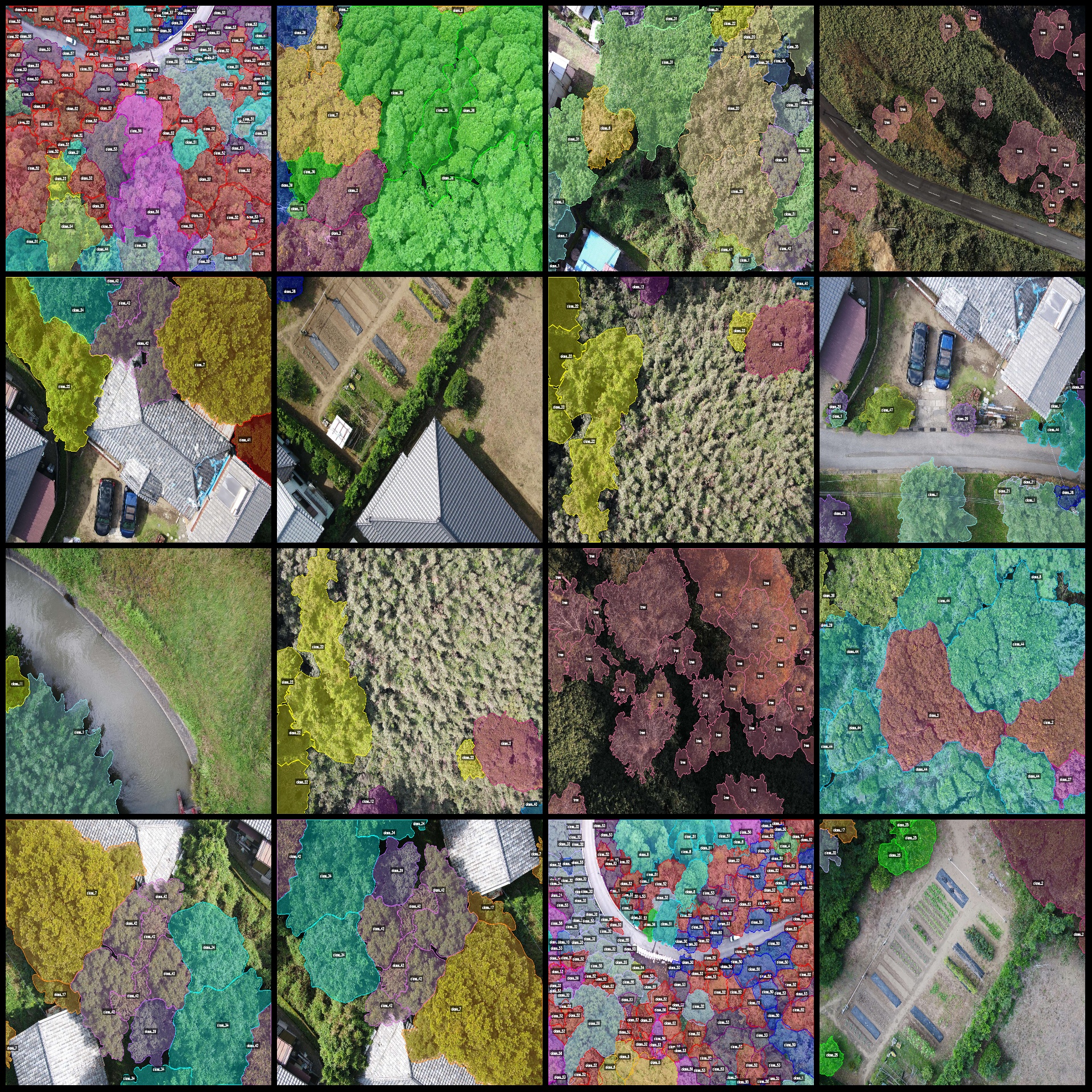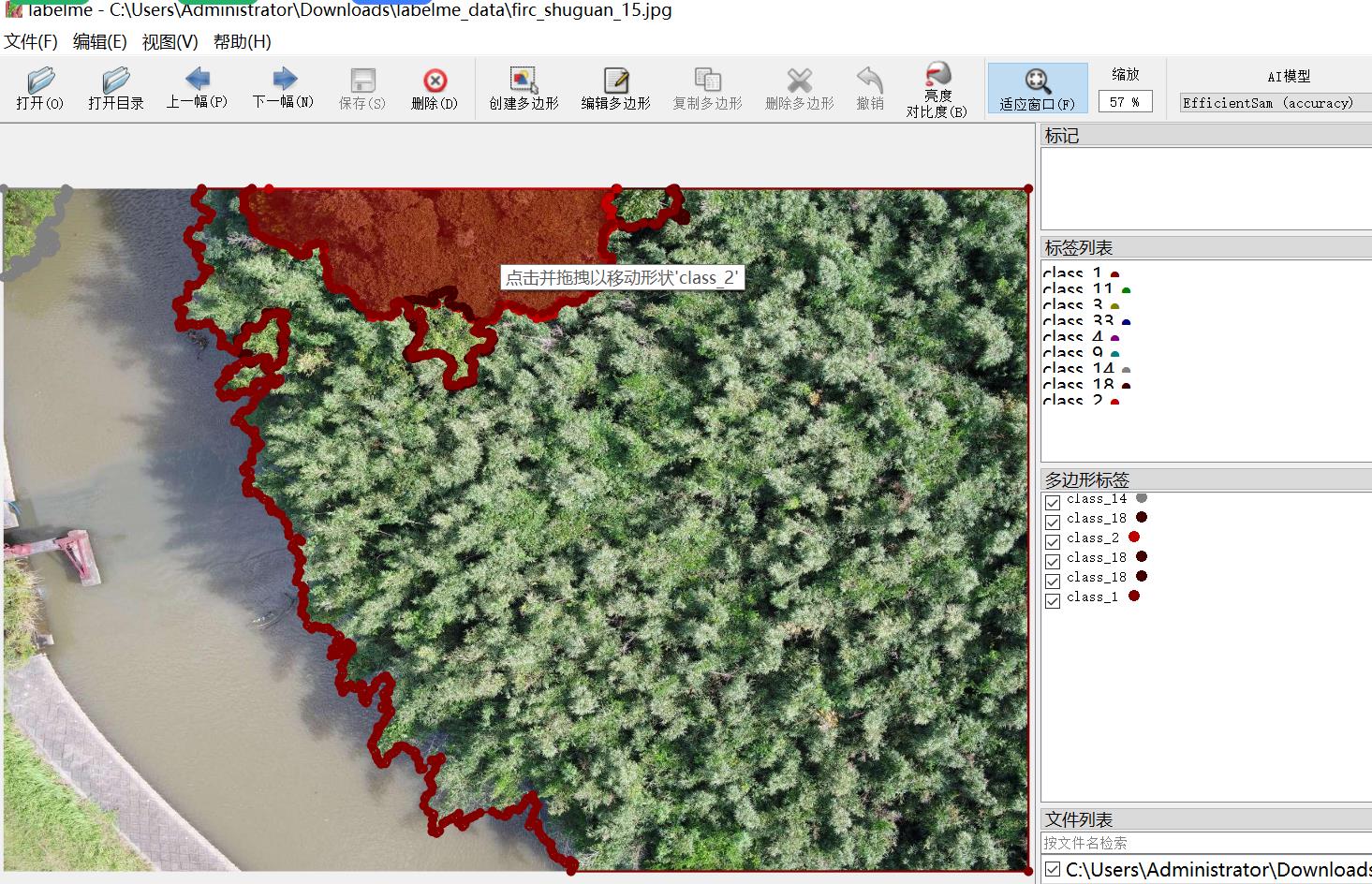 注意class1是很多小树冠,class数字表示不同树木树冠,由于种类太多无法清除具体什么树木树冠。简单起见可以把class数字改成一个类别名叫树冠就行,这里标注时候细分了。