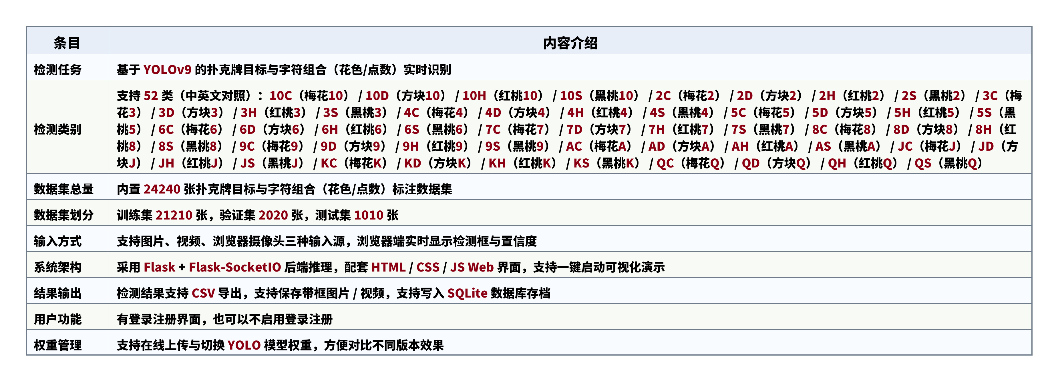 数据集总量:内置 24240 张扑克牌目标与字符组合(花色/点数)标注数据集
