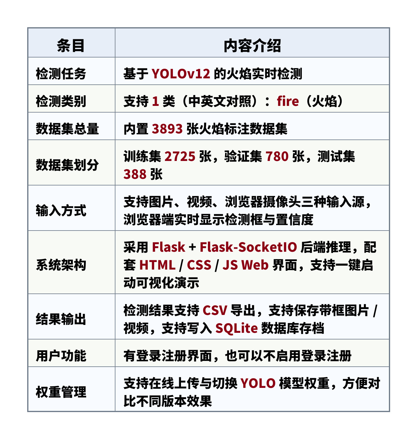 - 检测类别:支持 1 类(中英文对照):fire(火焰)