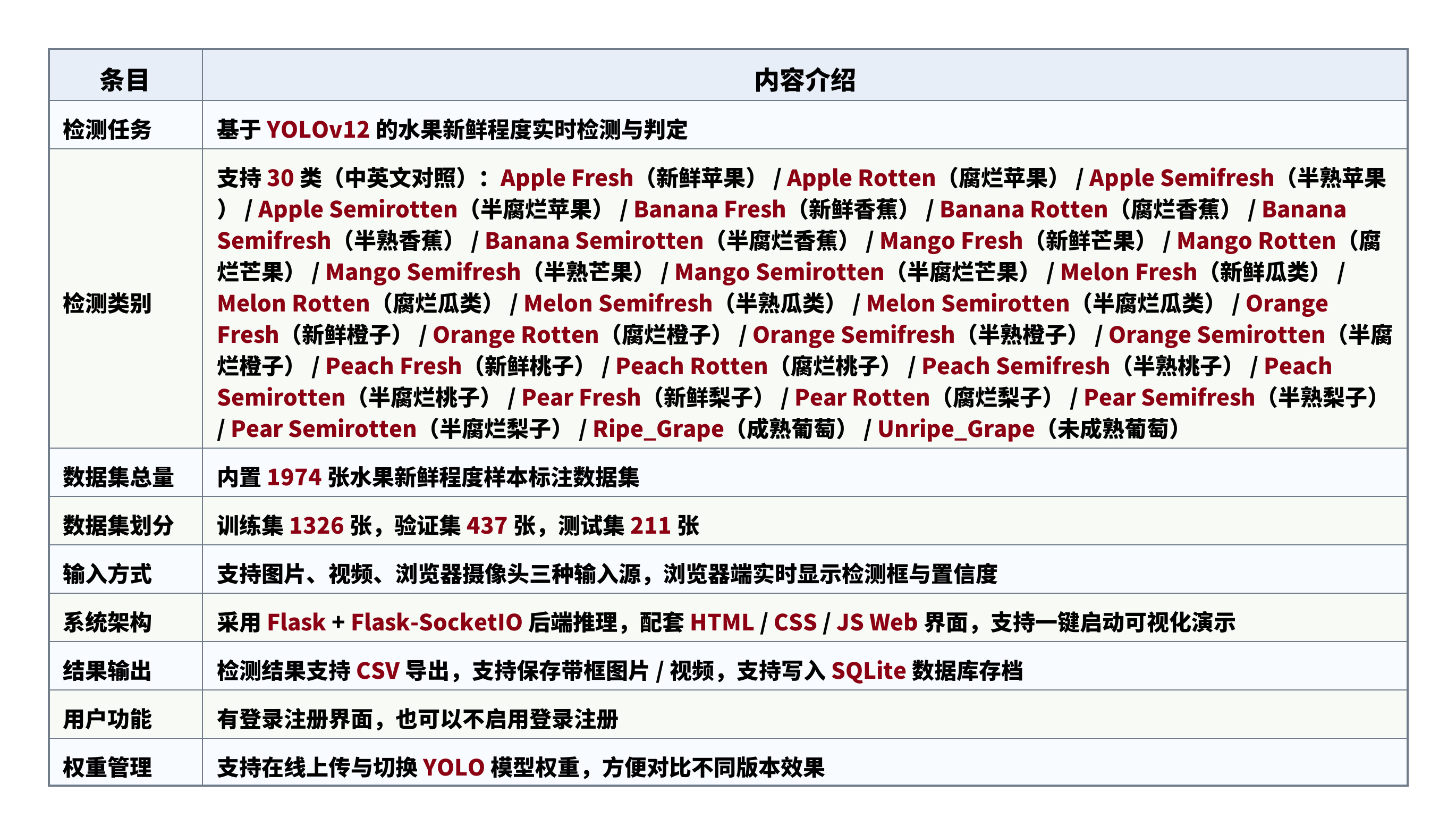 - 检测类别:支持 30 类(中英文对照):Apple Fresh(新鲜苹果) / Apple Rotten(腐烂苹果) / Apple Semifresh(半熟苹果) / Apple Semirotten(半腐烂苹果) / Banana Fresh(新鲜香蕉) / Banana Rotten(腐烂香蕉) / Banana Semifresh(半熟香蕉) / Banana Semirotten(半腐烂香蕉) / Mango Fresh(新鲜芒果) / Mango Rotten(腐烂芒果) / Mango Semifresh(半熟芒果) / Mango Semirotten(半腐烂芒果) / Melon Fresh(新鲜瓜类) / Melon Rotten(腐烂瓜类) / Melon Semifresh(半熟瓜类) / Melon Semirotten(半腐烂瓜类) / Orange Fresh(新鲜橙子) / Orange Rotten(腐烂橙子) / Orange Semifresh(半熟橙子) / Orange Semirotten(半腐烂橙子) / Peach Fresh(新鲜桃子) / Peach Rotten(腐烂桃子) / Peach Semifresh(半熟桃子) / Peach Semirotten(半腐烂桃子) / Pear Fresh(新鲜梨子) / Pear Rotten(腐烂梨子) / Pear Semifresh(半熟梨子) / Pear Semirotten(半腐烂梨子) / Ripe_Grape(成熟葡萄) / Unripe_Grape(未成熟葡萄)