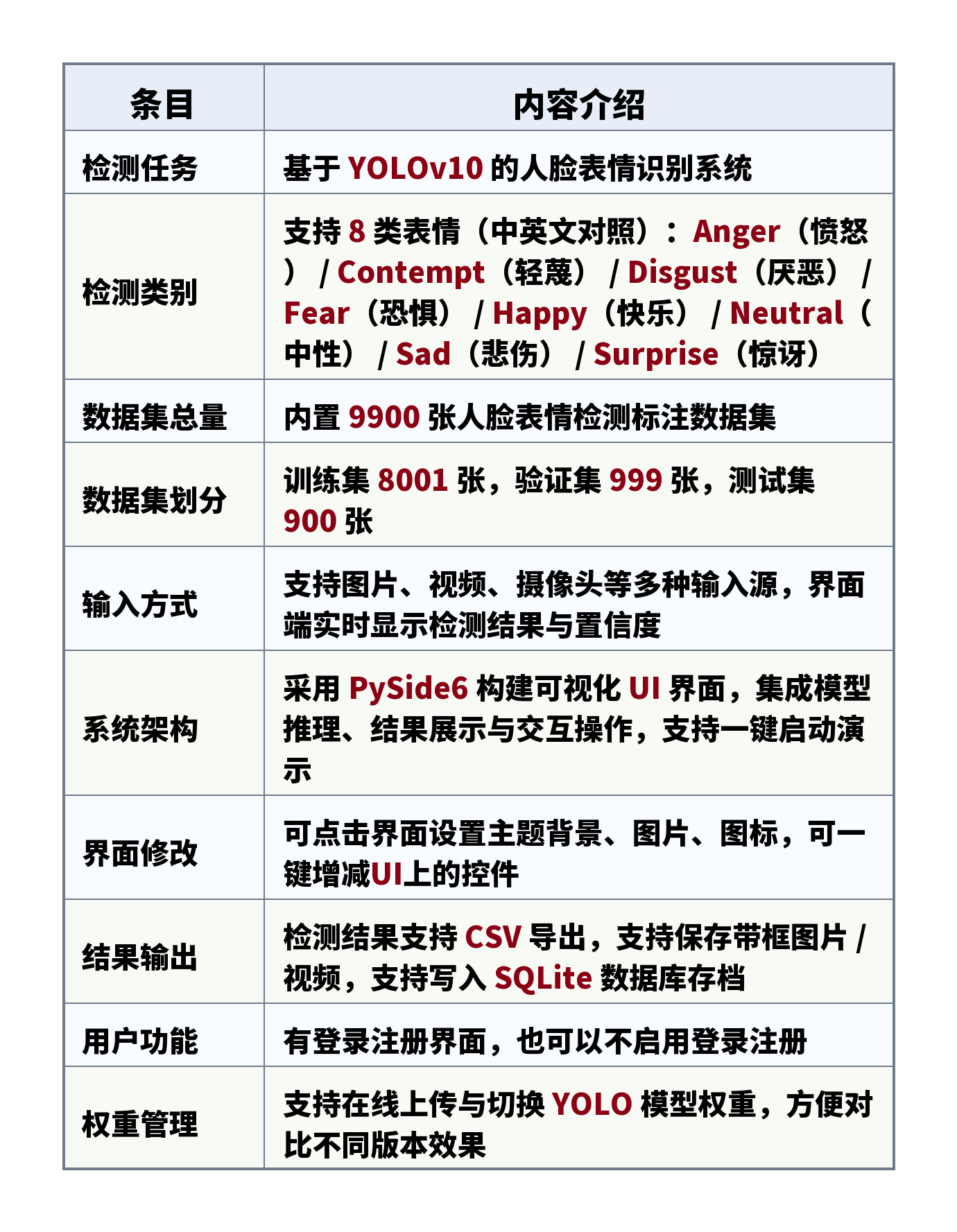 检测类别:支持 8 类表情(中英文对照):Anger(愤怒) / Contempt(轻蔑) / Disgust(厌恶) / Fear(恐惧) / Happy(快乐) / Neutral(中性) / Sad(悲伤) / Surprise(惊讶)