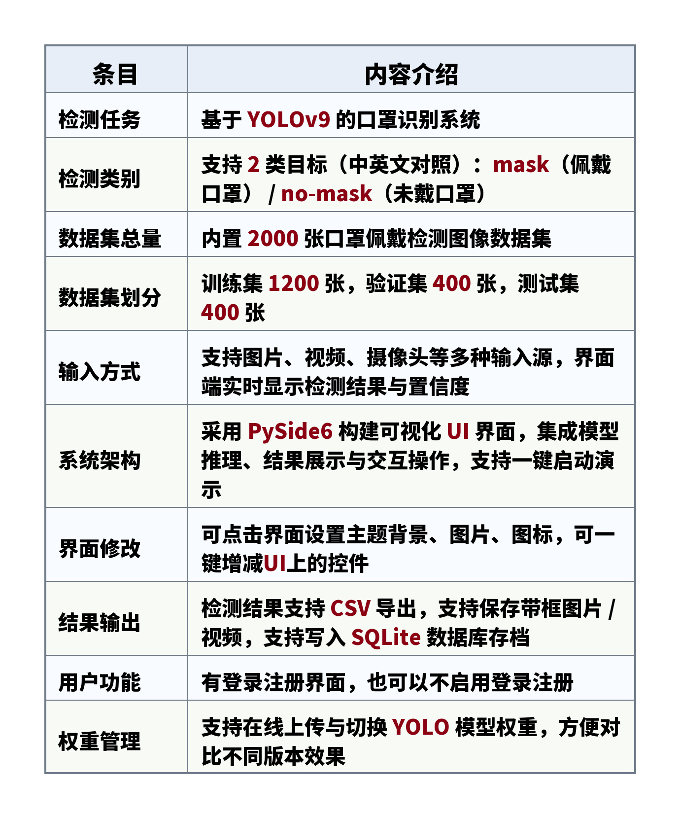 检测类别:支持 2 类目标(中英文对照):mask(佩戴口罩) / no-mask(未戴口罩)