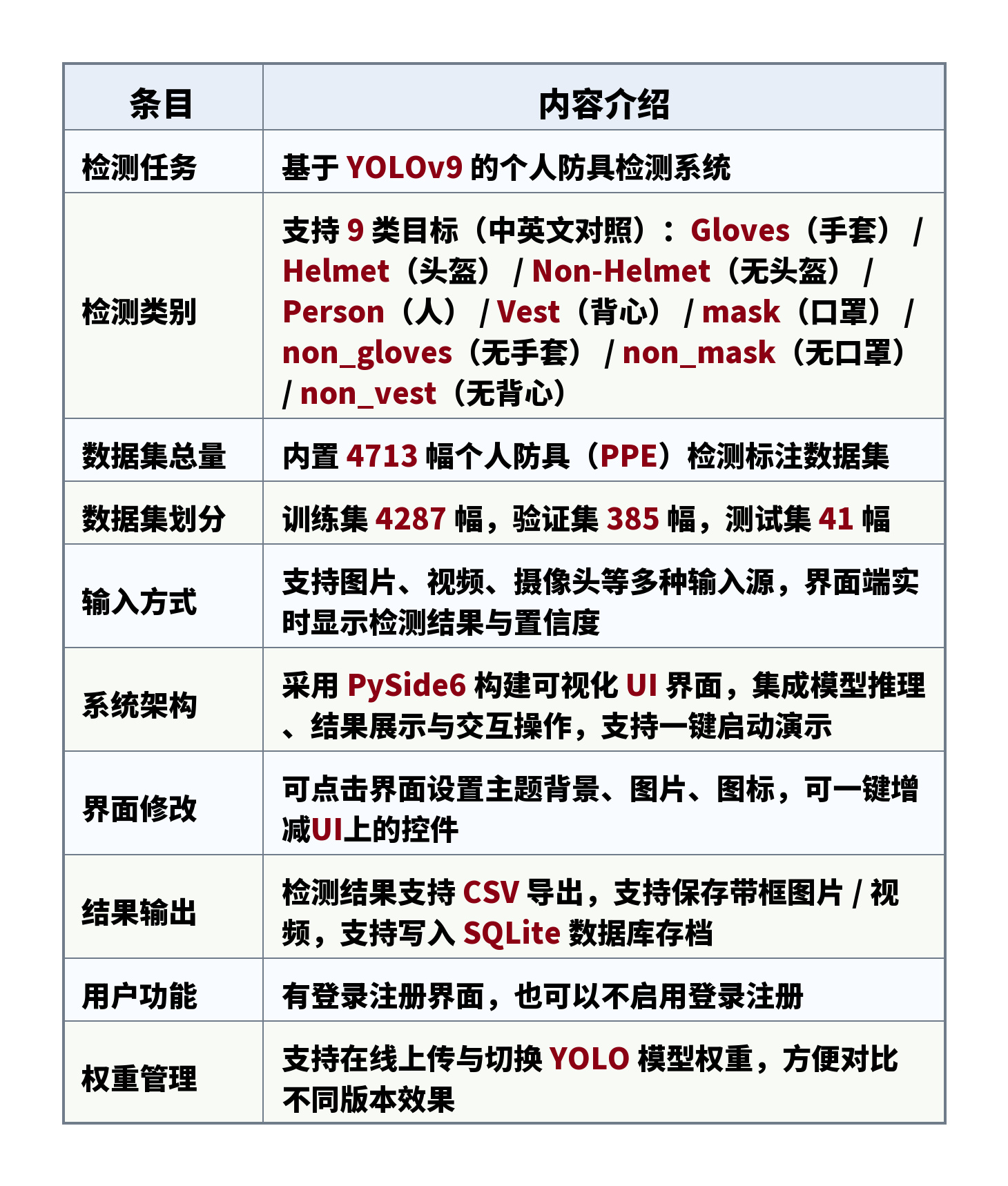 检测类别:支持 9 类目标(中英文对照):Gloves(手套) / Helmet(头盔) / Non-Helmet(无头盔) / Person(人) / Vest(背心) / mask(口罩) / non_gloves(无手套) / non_mask(无口罩) / non_vest(无背心)