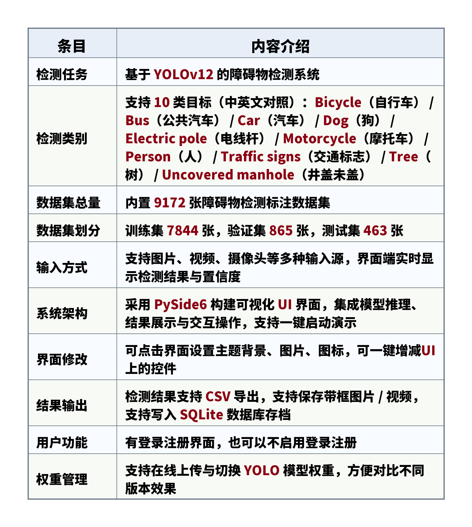 检测类别:支持 10 类目标(中英文对照):Bicycle(自行车) / Bus(公共汽车) / Car(汽车) / Dog(狗) / Electric pole(电线杆) / Motorcycle(摩托车) / Person(人) / Traffic signs(交通标志) / Tree(树) / Uncovered manhole(井盖未盖)