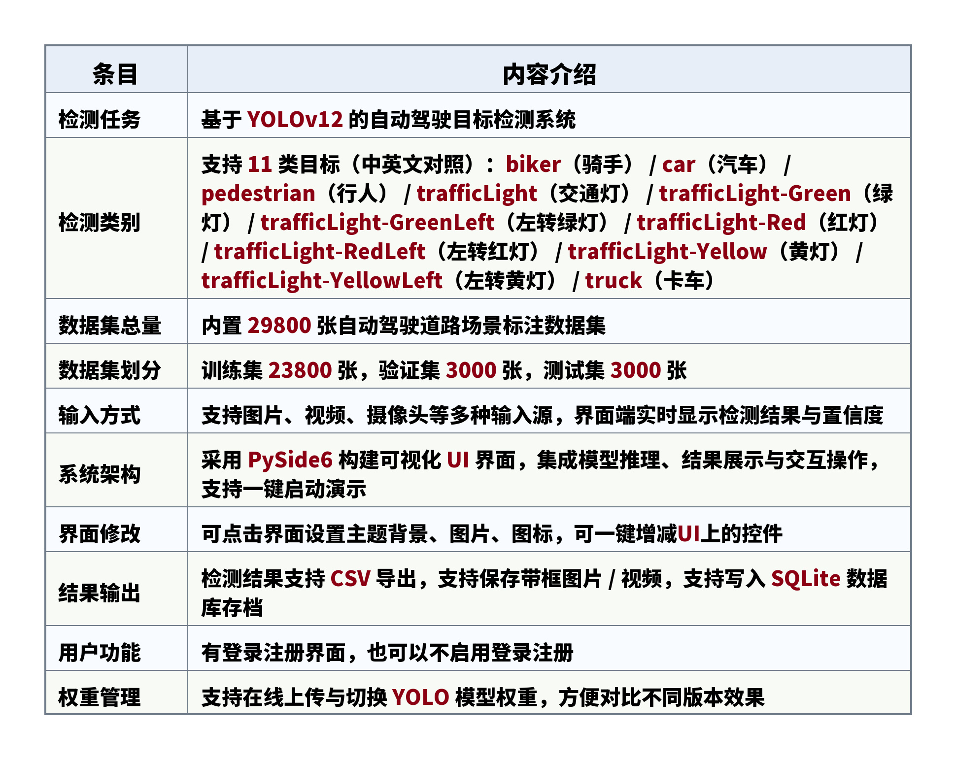 检测类别:支持 11 类目标(中英文对照):biker(骑手) / car(汽车) / pedestrian(行人) / trafficLight(交通灯) / trafficLight-Green(绿灯) / trafficLight-GreenLeft(左转绿灯) / trafficLight-Red(红灯) / trafficLight-RedLeft(左转红灯) / trafficLight-Yellow(黄灯) / trafficLight-YellowLeft(左转黄灯) / truck(卡车)