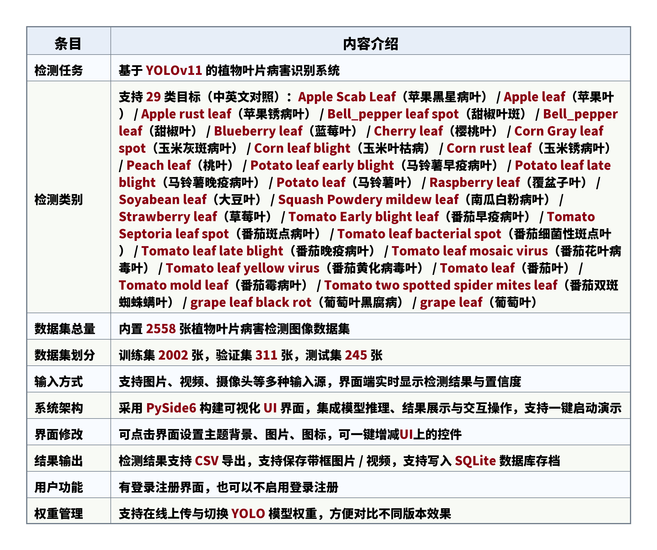 检测类别:支持 29 类目标(中英文对照):Apple Scab Leaf(苹果黑星病叶) / Apple leaf(苹果叶) / Apple rust leaf(苹果锈病叶) / Bell_pepper leaf spot(甜椒叶斑) / Bell_pepper leaf(甜椒叶) / Blueberry leaf(蓝莓叶) / Cherry leaf(樱桃叶) / Corn Gray leaf spot(玉米灰斑病叶) / Corn leaf blight(玉米叶枯病) / Corn rust leaf(玉米锈病叶) / Peach leaf(桃叶) / Potato leaf early blight(马铃薯早疫病叶) / Potato leaf late blight(马铃薯晚疫病叶) / Potato leaf(马铃薯叶) / Raspberry leaf(覆盆子叶) / Soyabean leaf(大豆叶) / Squash Powdery mildew leaf(南瓜白粉病叶) / Strawberry leaf(草莓叶) / Tomato Early blight leaf(番茄早疫病叶) / Tomato Septoria leaf spot(番茄斑点病叶) / Tomato leaf bacterial spot(番茄细菌性斑点叶) / Tomato leaf late blight(番茄晚疫病叶) / Tomato leaf mosaic virus(番茄花叶病毒叶) / Tomato leaf yellow virus(番茄黄化病毒叶) / Tomato leaf(番茄叶) / Tomato mold leaf(番茄霉病叶) / Tomato two spotted spider mites leaf(番茄双斑蜘蛛螨叶) / grape leaf black rot(葡萄叶黑腐病) / grape leaf(葡萄叶)