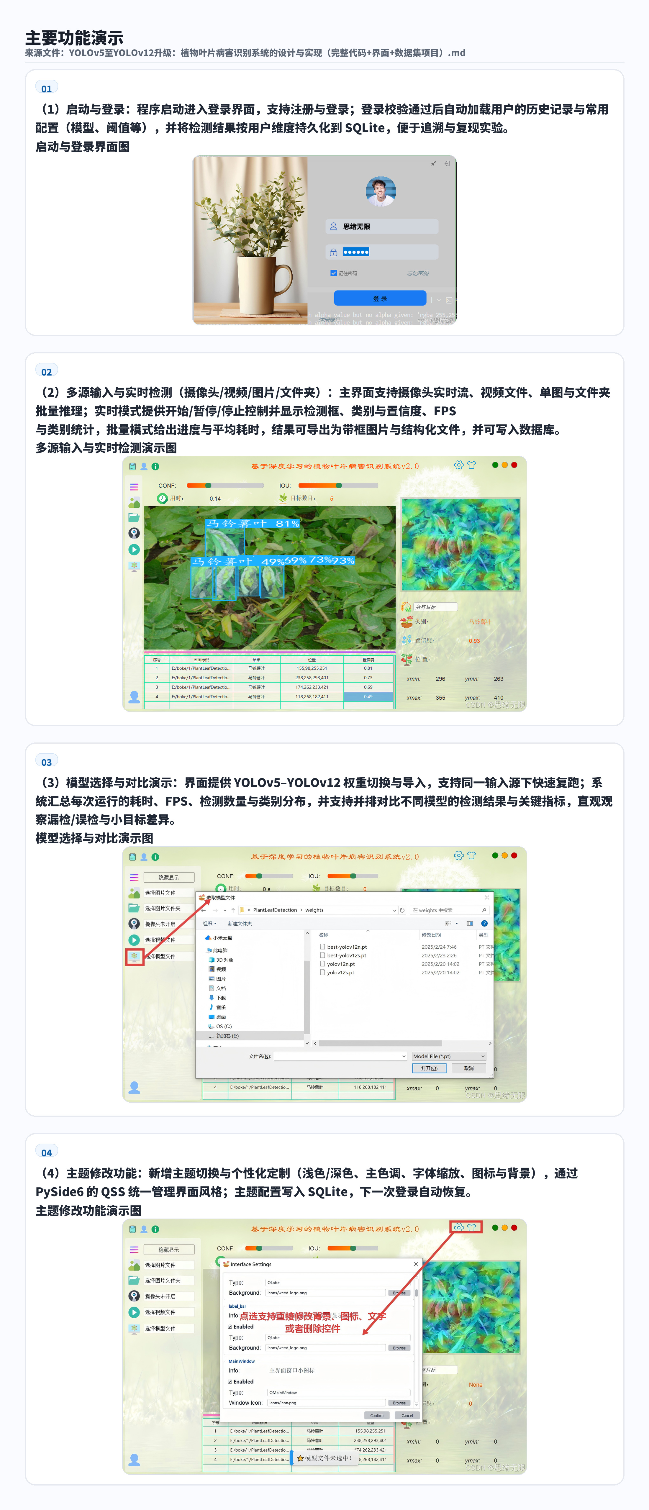 系统架构:采用 PySide6 构建可视化 UI 界面,集成模型推理、结果展示与交互操作,支持一键启动演示