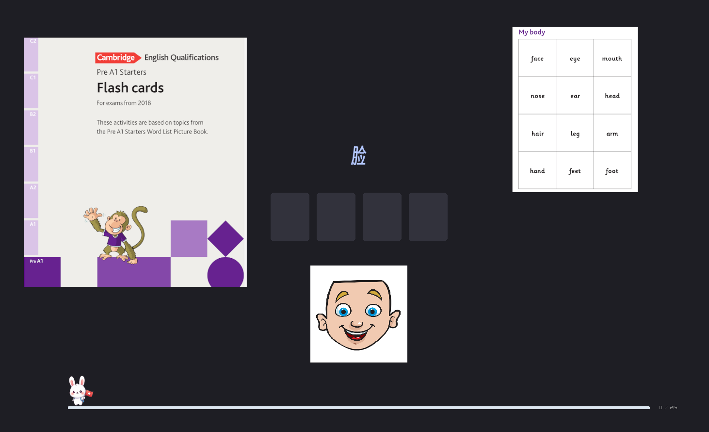 作品简介 根据剑桥英语starters闪卡制作而成的spellauncher单词本,共计215个单词.解压后放到 spellauncher 目录替换掉原来的 words.txt 和 images 即可. 创作时间: