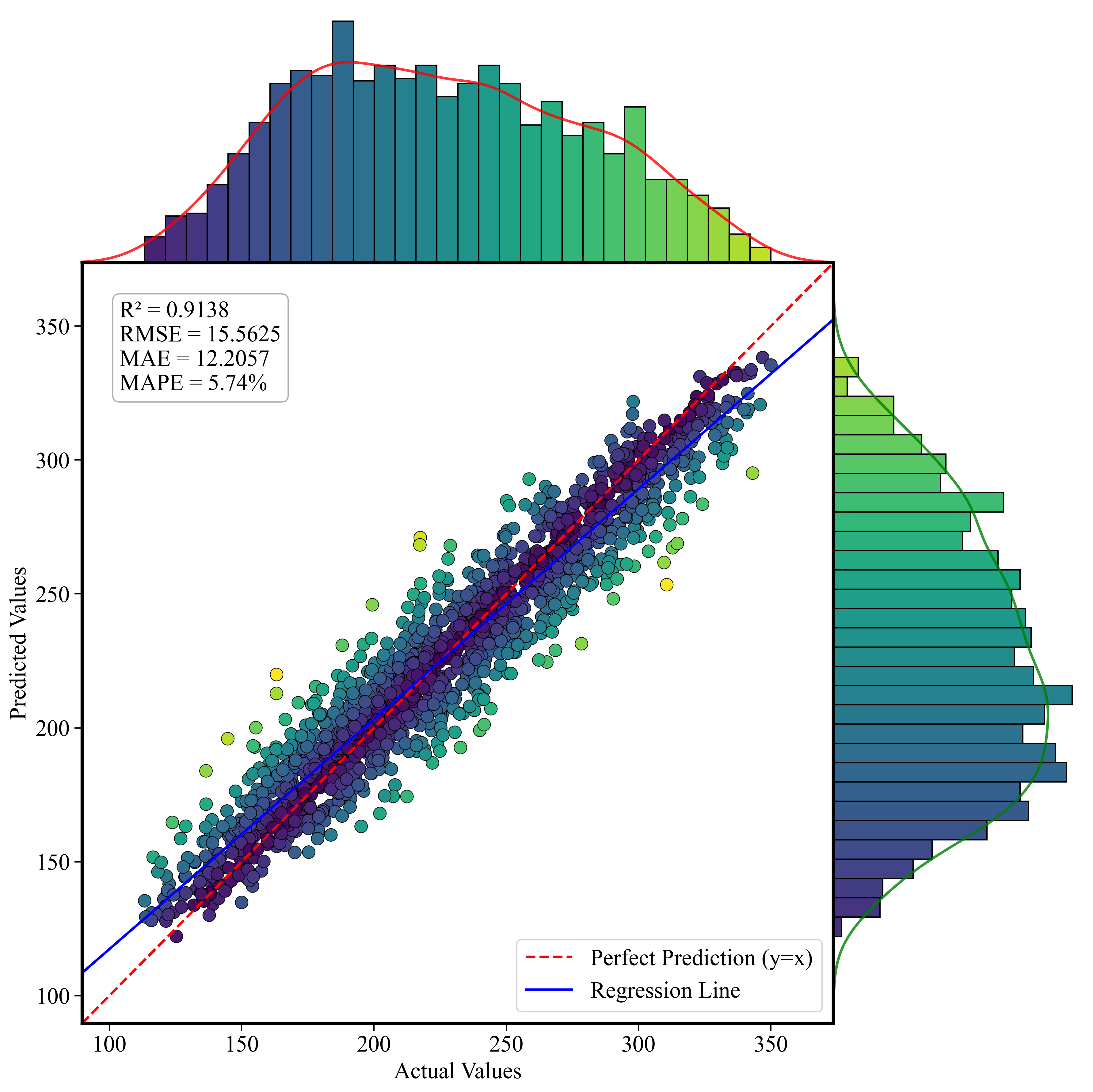 关键指标(R²、RMSE、MAE、MAPE)直接标注在图上