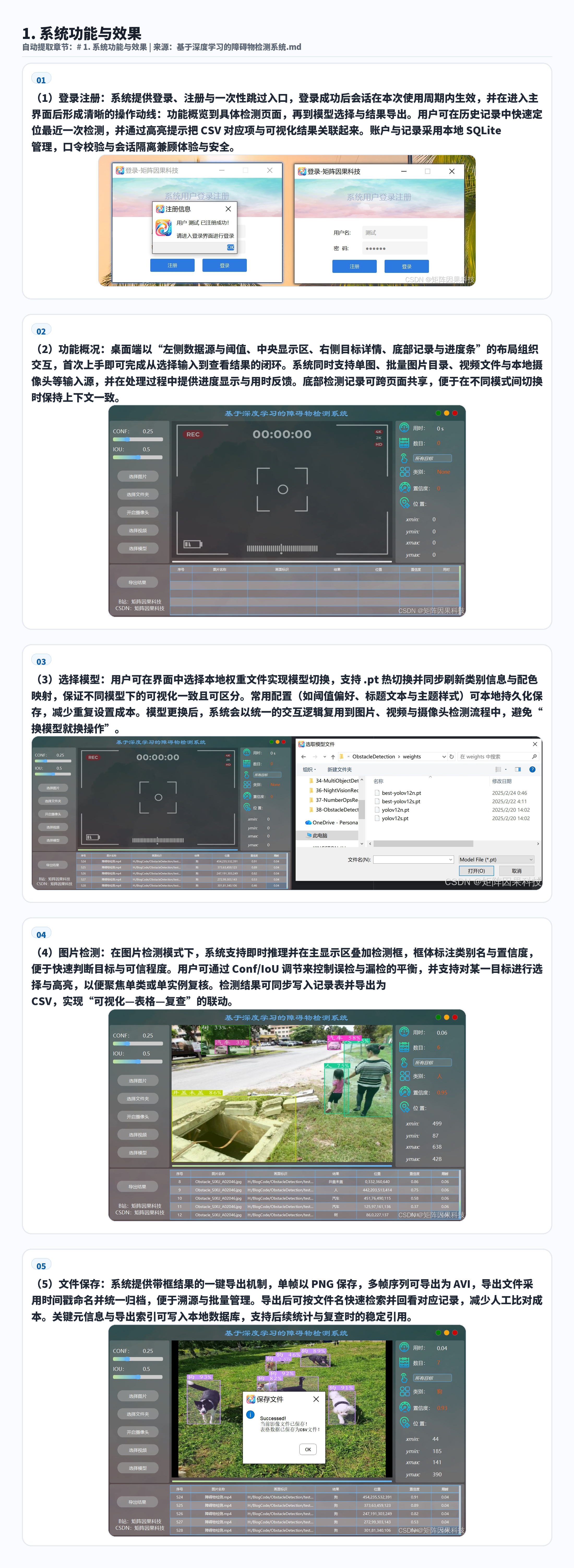 结果输出:检测结果支持 CSV 导出,支持保存带框图片 / 视频,支持写入 SQLite 数据库存档