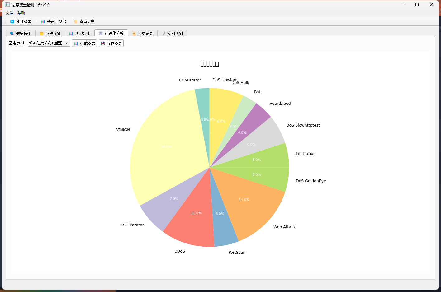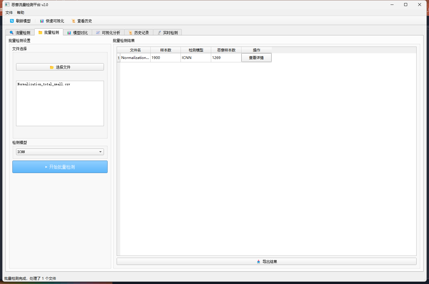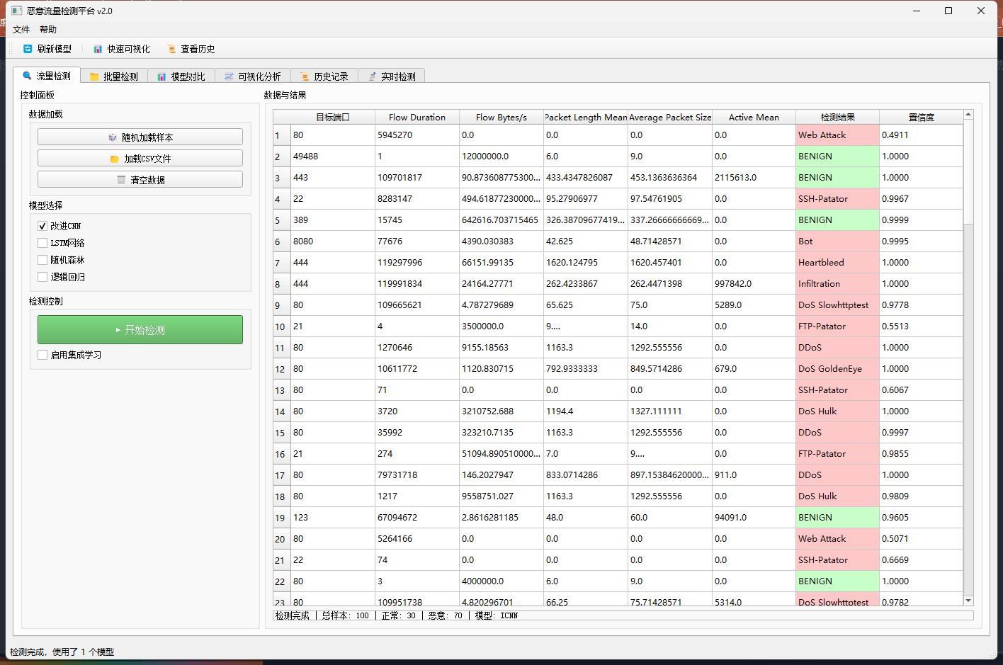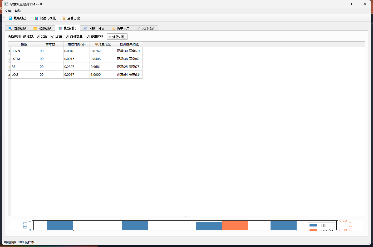 基于PyQt5的恶意加密流量检测平台,支持多种深度学习与传统机器学习模型,提供批量检测、模型对比、可视化分析和历史记录管理功能。