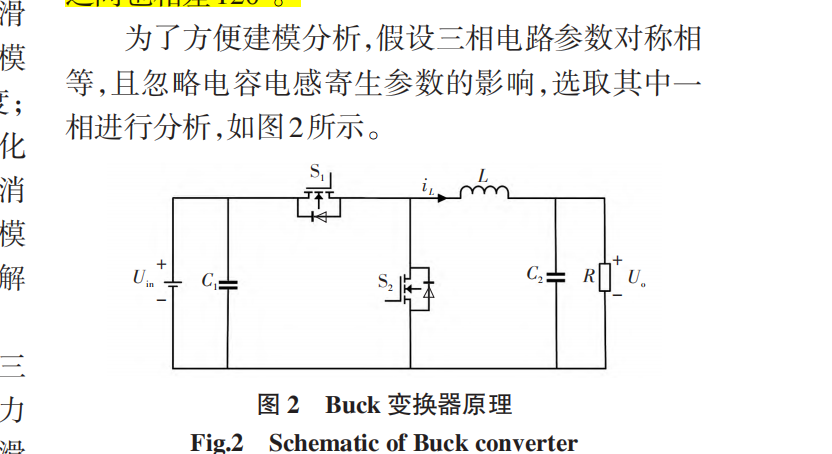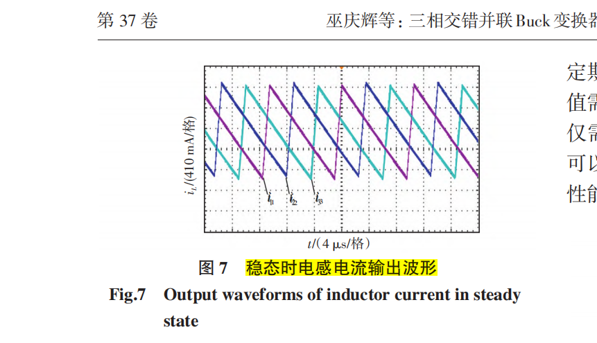 交错并联 DC-DC 变换器因具有功率密度大、 瞬态响应速度快以及电流纹波小等优点[1] ,已广泛 应用于电动汽车、光伏发电、储能系统等领域[2] 。随 着新能源行业的不断发展,对电能质量的要求也随 之增高,传统DC-DC变换器的可靠性面临巨大挑战, 当输出电流纹波较大时,会严重影响设备性能,而交错并联Buck变换器能够大幅减小输出电流纹波,同时具备提高功率等级和降低开关应力等特点[3] 。