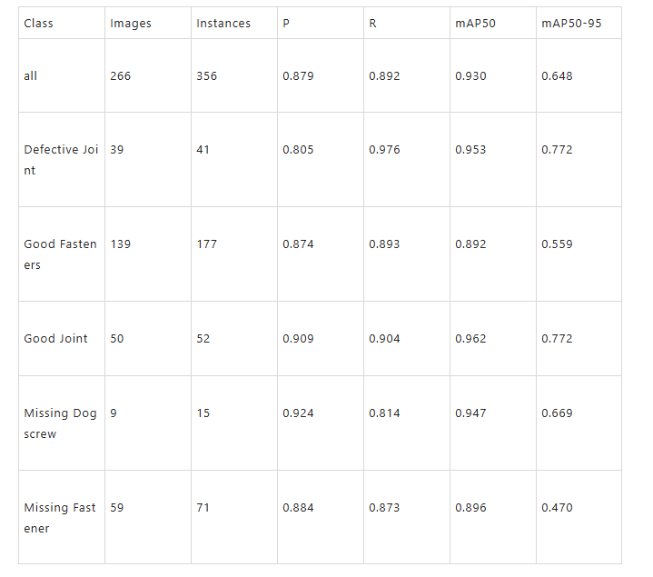 标注类别名称(注意yolo格式类别顺序不和这个对应,而以labels文件夹classes.txt为准):[‘Defective Joint’,‘Good Fasteners’,‘Good Joint’,‘Missing Dogscrew’,‘Missing Fastener’]