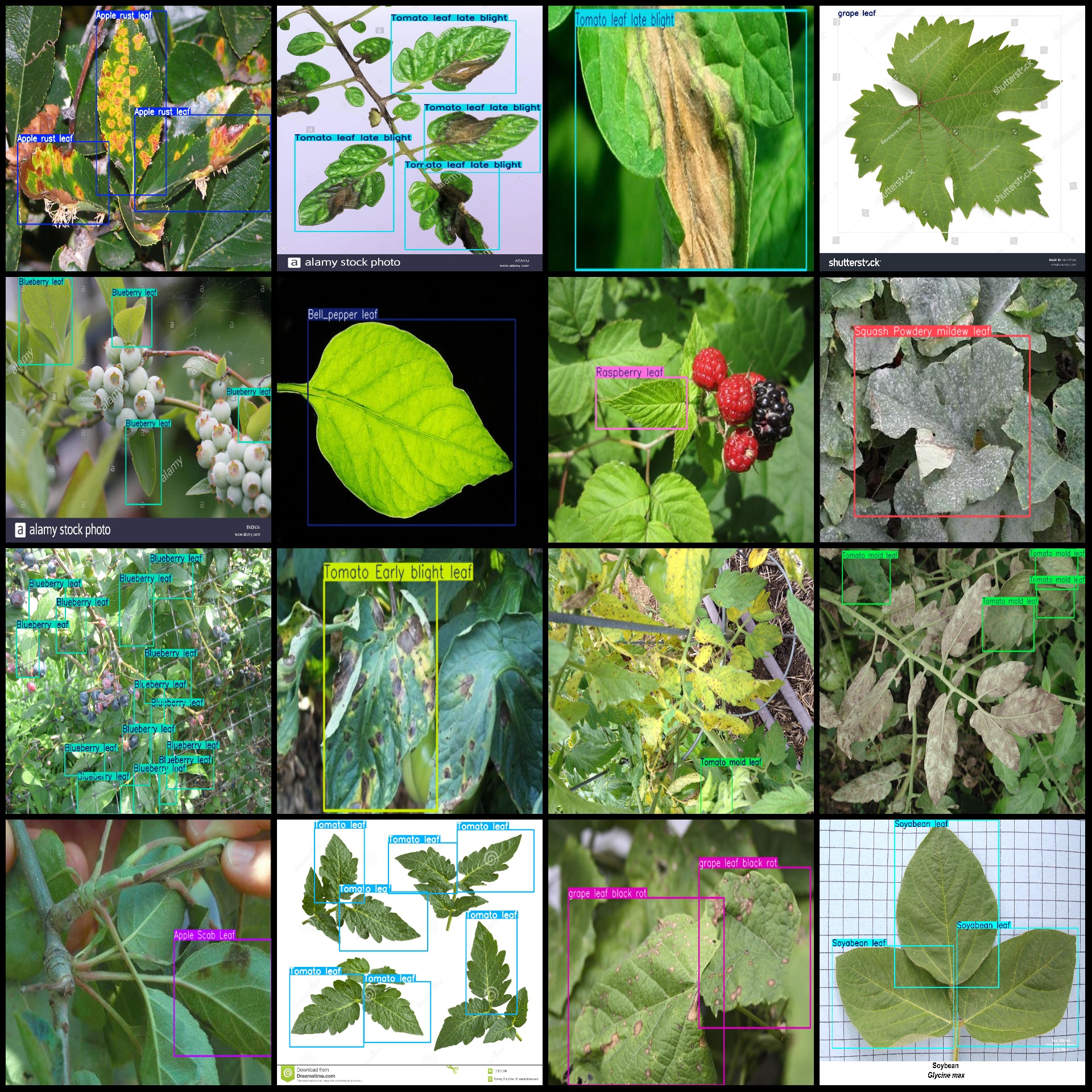 标注类别名称(注意yolo格式类别顺序不和这个对应,而以labels文件夹classes.txt为准):["Apple Scab Leaf","Apple leaf","Apple rust leaf","Bell_pepper leaf","Bell_pepper leaf spot","Blueberry leaf","Cherry leaf","Corn Gray leaf spot","Corn leaf blight","Corn rust leaf","Peach leaf","Potato leaf","Potato leaf early blight","Potato leaf late blight","Raspberry leaf","Soyabean leaf","Soybean leaf","Squash Powdery mildew leaf","Strawberry leaf","Tomato Early blight leaf","Tomato Septoria leaf spot","Tomato leaf","Tomato leaf bacterial spot","Tomato leaf late blight","Tomato leaf mosaic virus","Tomato leaf yellow virus","Tomato mold leaf","Tomato two spotted spider mites leaf","grape leaf","grape leaf black rot"]
