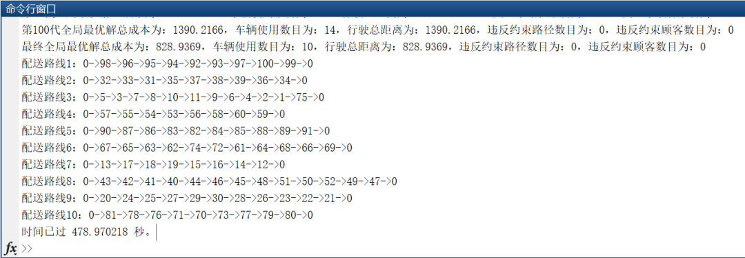 我们得到的结果为车辆使用数目为10,车辆形式总距离为828.94。
