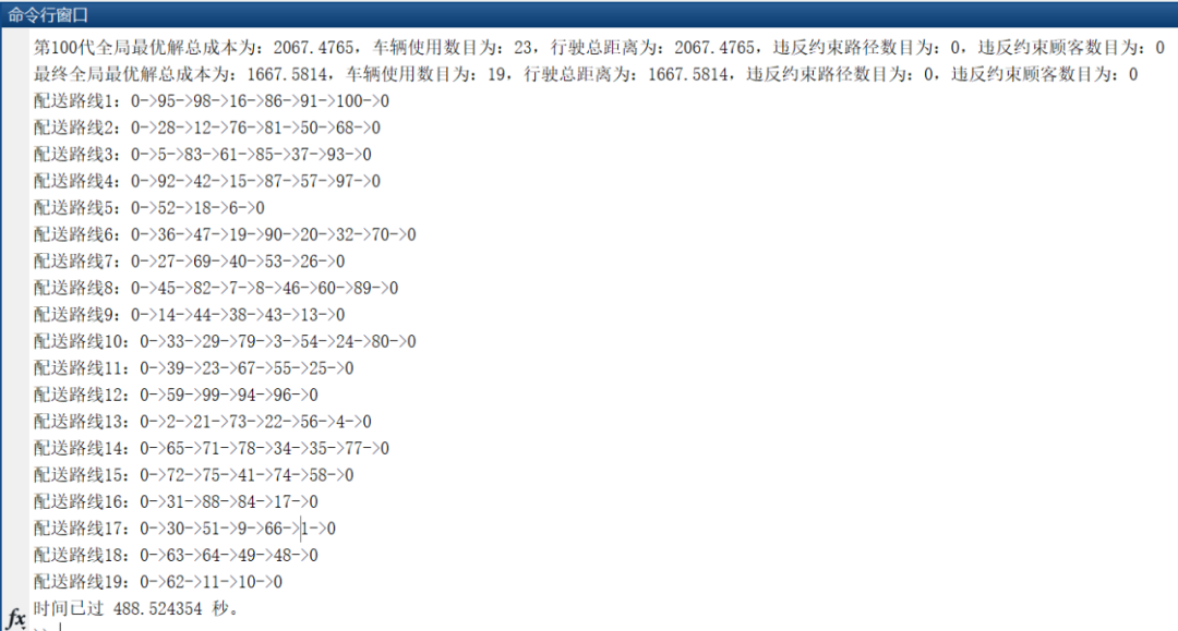 我们得到的结果为车辆使用数目为19,车辆形式总距离为1667.58。