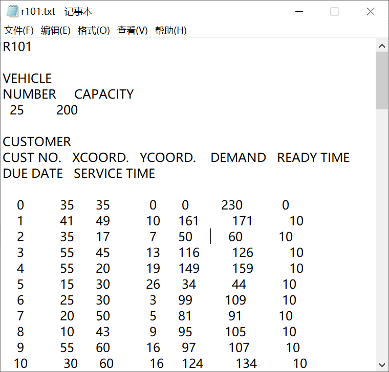 首先来看VEHICLE数据,NUMBER表示车辆最大使用数目,即在r101算例中车辆最大使用数目为25;CAPACITY表示每辆车的最大装载量,即在r101算例中每辆车的最大装载量为200;