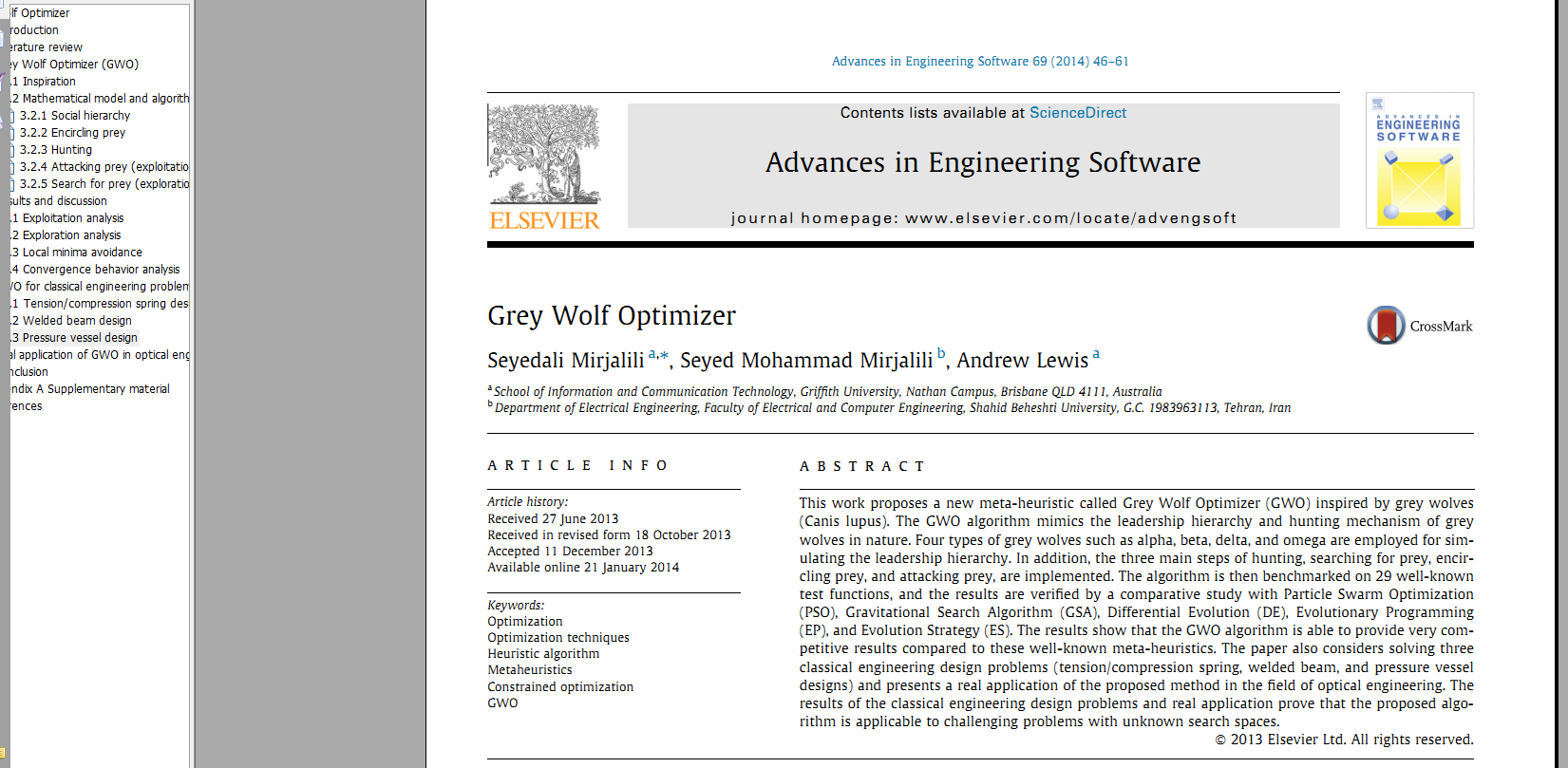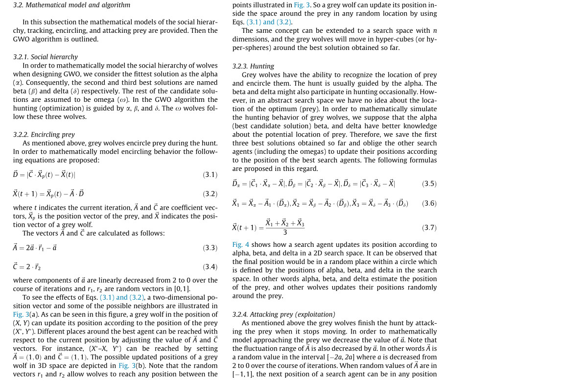 灰狼优化算法(Grey Wolf Optimizer,GWO)由澳大利亚格里菲斯大学学者 Mirjalili 等人于2014年提出来的一种群智能优化算法。该算法受到了灰狼捕食猎物活动的启发而开发的一种优化搜索方法,它具有较强的收敛性能、参数少、易实现等特点。近年来受到了学者的广泛关注,它己被成功地应用到了车间调度、参数优化、图像分类等领域中。原论文部分截图如下: