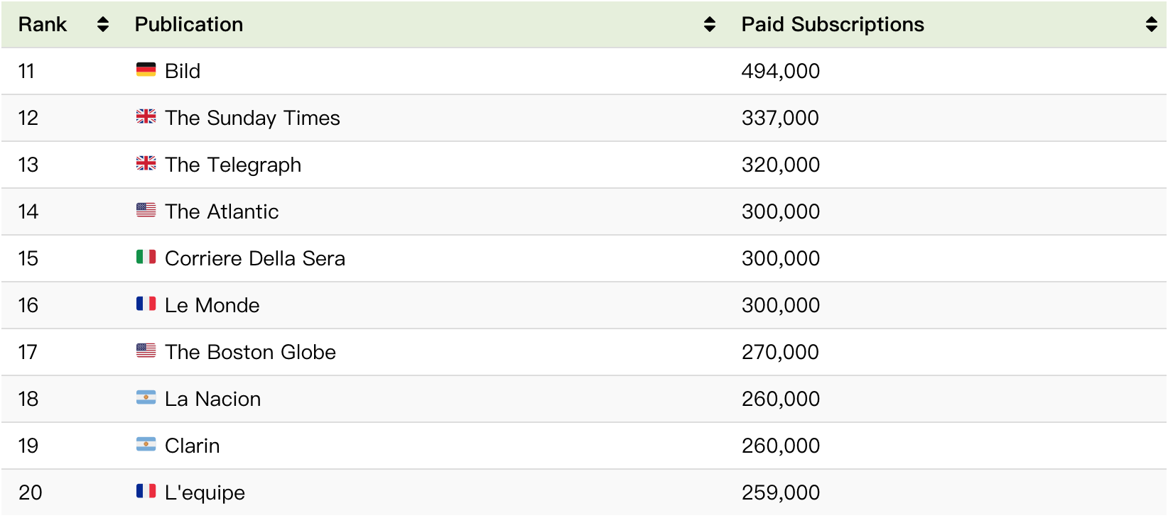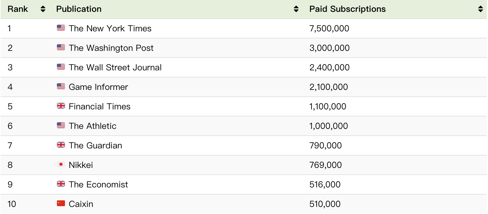 图表:根据付费订阅者数量的新闻网站排名