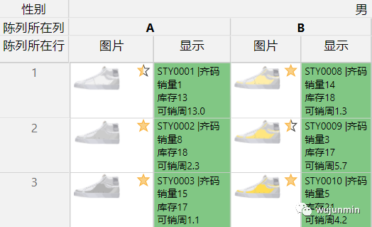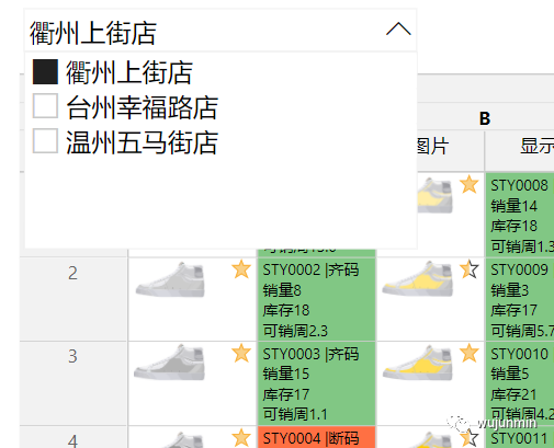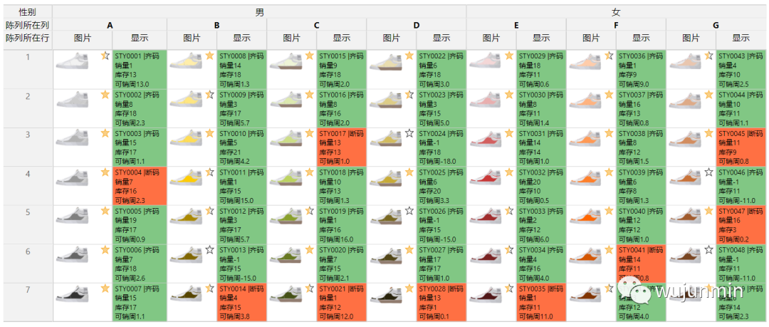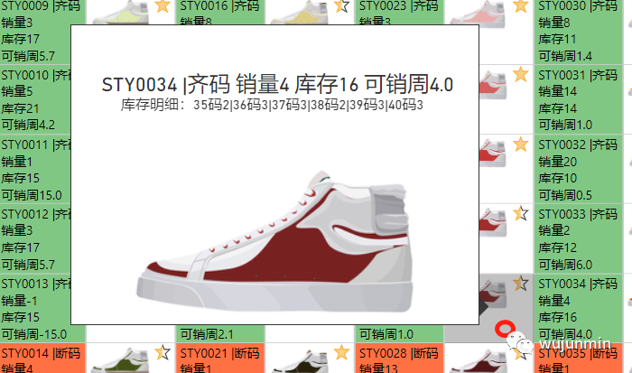 3.库存多少,是否断码(绿色背景表示尺码齐全,橙色表示断码)