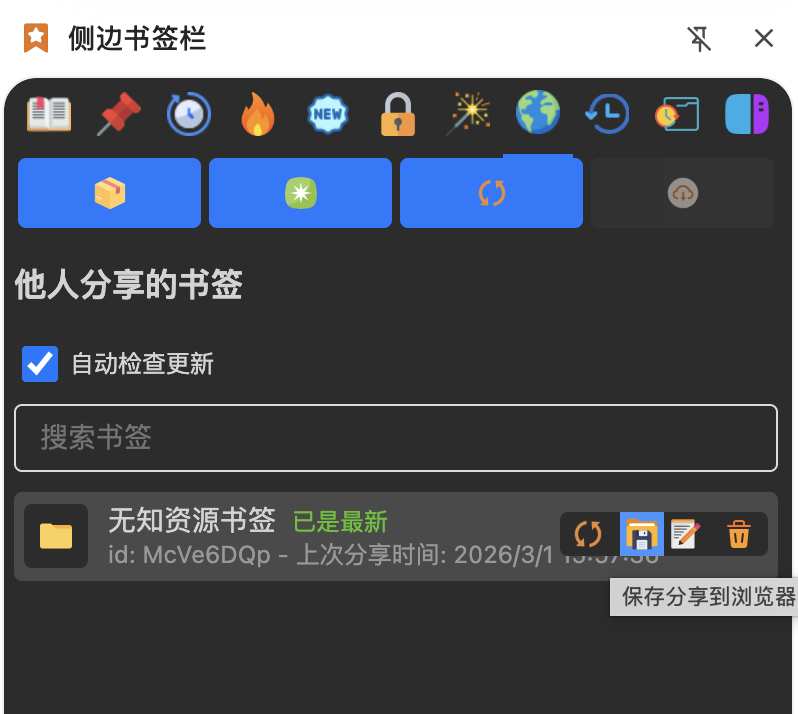- 每月一键更新: 每月初自动清理死链、新增宝藏。你只需在侧边书签栏插件里点两下鼠标(刷新+保存),就能一键同步到最新版书签!