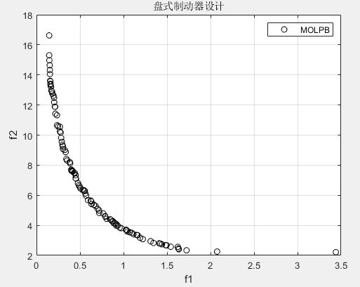 MOLPB求解9个多目标测试函数(ZDT1、ZDT2、ZDT3、ZDT4、ZDT6、Kursawe、Poloni、Viennet2、Viennet3)以及1个工程应用(盘式制动器设计),并采用IGD、GD、HV、SP进行指标评价。部分结果如下: