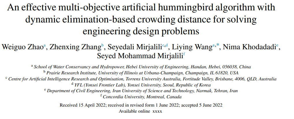 [1]Weiguo Zhao, Zhenxing Zhang, Seyedali Mirjalili, Liying Wang, Nima Khodadadi, Seyed Mohammad Mirjalili.An effective multi-objective artificial hummingbird algorithm with dynamic elimination-based crowding distance for solving engineering design problems,Computer Methods in Applied Mechanics and Engineering, 398,2022,