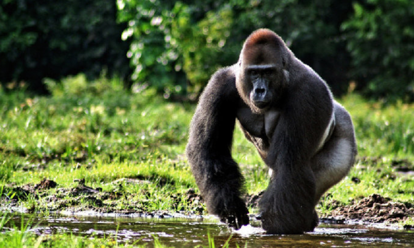 大猩猩体型比黑猩猩、猩猩都要大得多,是最大的类人猿,也是最大的灵长类动物。大猩猩的身体极为粗壮、剽悍和鲁莽,身高与人类相差不多,但体重则要大得多。一般全身被黑色长毛,但面部、耳朵、手足等均无毛,也没有须毛,颜面皮肤皱褶很多,长相十分丑陋而凶恶。头大,额低,头顶部有发达的矢状脊,雄兽还有较厚的冠垫,所以显得高大隆起如塔,眉脊高耸。双眼深深凹陷,距离较宽,眼膜为褐色。鼻梁塌陷,鼻孔特大而且具有光泽,有隆起的褶状鼻翼。耳朵很小。吻部突出,嘴巴很大,犬齿发达,如同老虎的獠牙一般。齿式与人类同。肩膀又宽又圆,脖子、四肢都异常粗壮,前肢长于后肢,垂立时过膝,两臂伸开时可达272厘米。手掌宽阔,拇指短粗,足为跖行性,大趾粗厚,较大程度地外展。没有尾巴,也没有胼胝和颊囊。