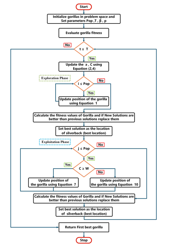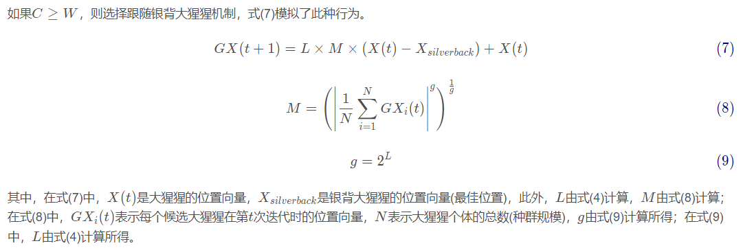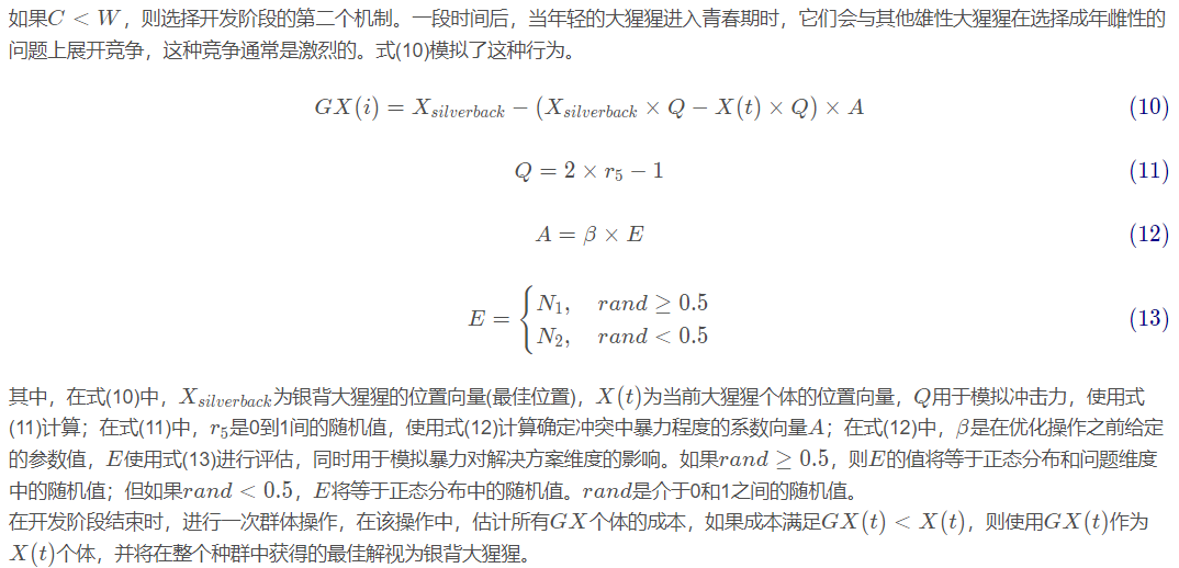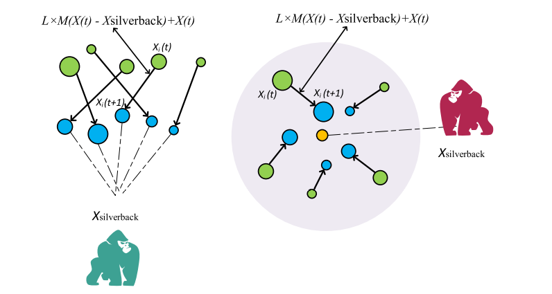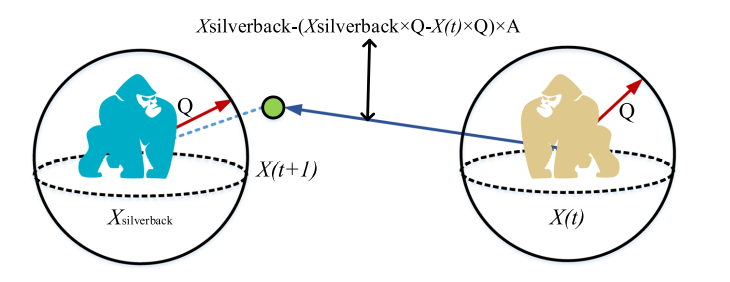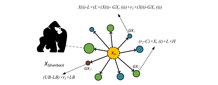 在GTO算法的开发阶段,采用了跟随银背大猩猩和竞争成年雌性的两种行为。银背大猩猩领导一个群体,做出所有决定,决定群体的行动,并引导大猩猩走向食物来源。它还负责团队的安全和福祉,团队中的所有大猩猩都遵守银背大猩猩的所有决策。另一方面,银背大猩猩可能会变弱、变老并最终死亡,群体中的黑背大猩猩可能会成为群体的领导者,或者其他雄性大猩猩可能会与银背大猩猩交战并主宰群体。