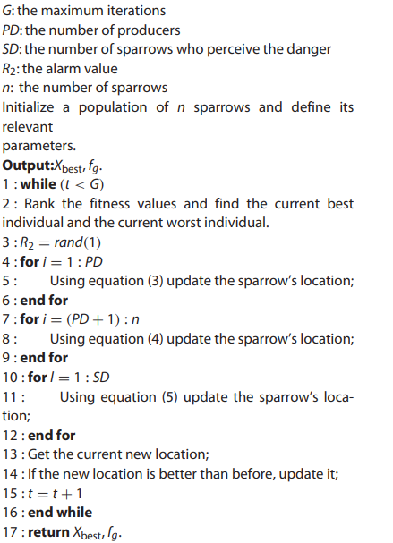 麻雀搜索算法(sparrow search algorithm,SSA)由Jiankai Xue等人于2020年提出,该算法是根据麻雀觅食并逃避捕食者的行为而提出的群智能优化算法。SSA 主要是受麻雀的觅食行为和反捕食行为的启发而提出的。该算法比较新颖,具有寻优能力强,收敛速度快的优点。麻雀群觅食过程也是发现者-跟随者模型的一种,同时还叠加了侦查预警机制。麻雀中找到食物较好的个体作为发现者,其他个体作为跟随者,同时种群中选取一定比例的个体进行侦查预警,如果发现危险则放弃食物,安全第一。