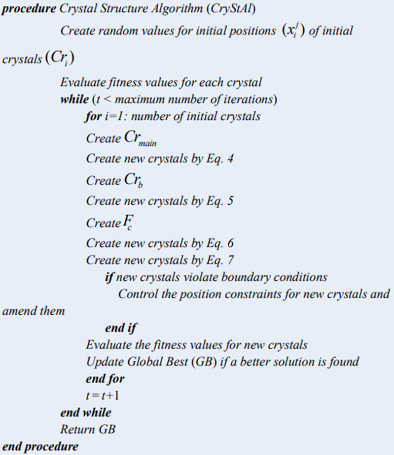 晶体结构算法(Crystal Structure Algorithm ,CryStAl)由Siamak Talatahari等人于2021年提出,该算法主要受从基向晶格点添加形成晶体结构的原理的启发。