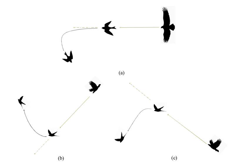 在下图中(a)转向策略(平面视图),(b)攀爬飞行和(c)潜水飞行(侧视图)。虚线在错过猎物后跟随捕食者的方式。