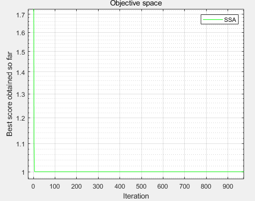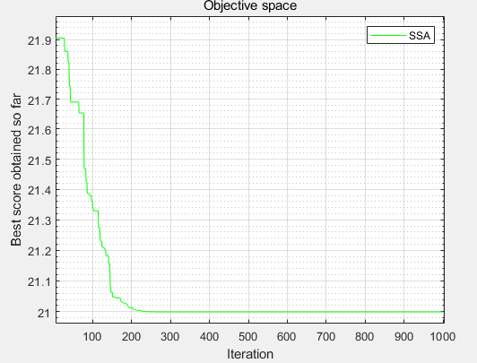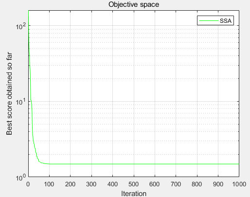 SSA在F1上可以快速找到最优值,在F5上求得的值也很接近理论值(加大迭代次数效果更理想),在F10上也具有极其出色的表现。由此可见,SSA在CEC2019上具有一定的竞争力。