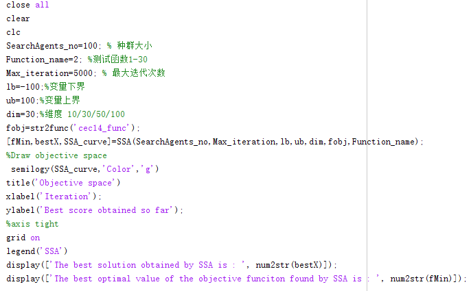 将麻雀搜索算法用于求解CEC2014,测试函数维度为30(可根据自己需求更改),种群大小为100,最大迭代次数为5000,部分实验结果如下:
