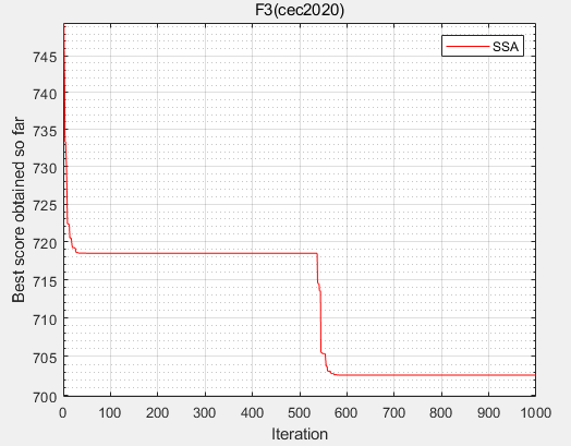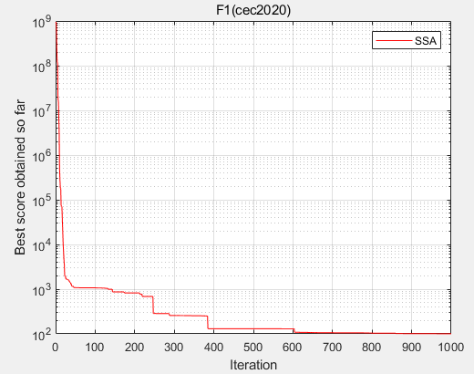 由此可以看出,SSA在求解CEC2020具有一定的潜力。SSA在前3个测试函数上快速求得的值与函数理论值十分接近,增大迭代次数效果更佳显著。SSA在cec2020上具有一定的竞争力。