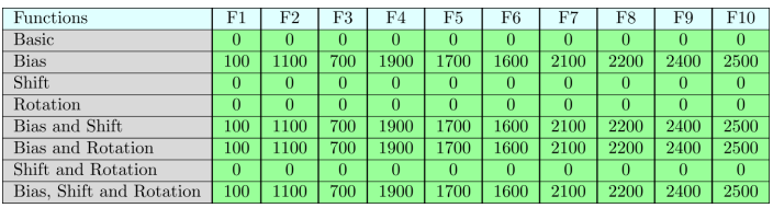 CEC2021共有10个基本测试函数,测试维度包含:10D、20D。CEC2021测试问题随着维度的增加求解极其困难。基本函数信息如下: