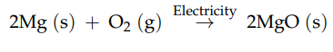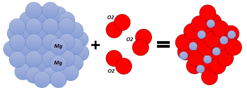 化学反应的一个例子描绘在下图中,其中镁丝(Mg)和氧气(O2)产生粉末状氧化镁(MgO)。如左灯泡所示,在反应发生之前,细镁丝被氧气包围。随着反应的进行,白色粉末状氧化镁覆盖灯泡的内表面,这在正确的灯泡中得到了证明。在这种反应中,热和光也作为中间材料产生,但在本描述中不涉及。所提化学反应的化学方程式如下: