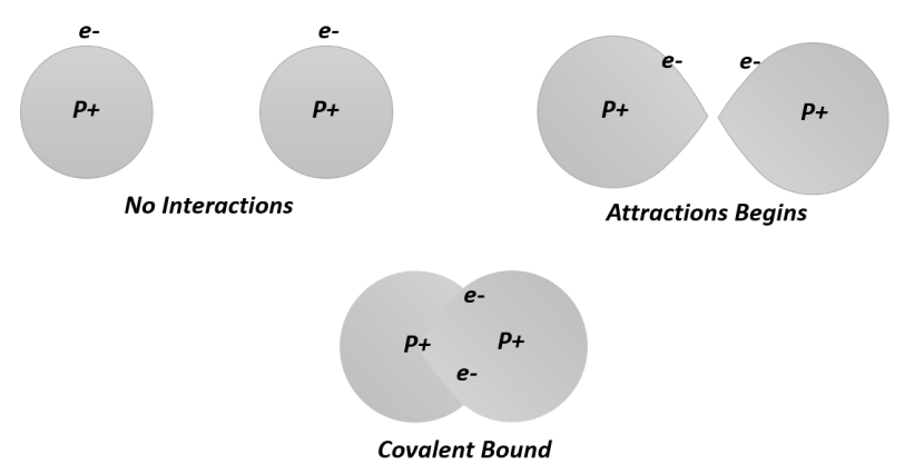 当化学元素的原子与另一个元素的原子共享电子时,共价化合物形成,这通常发生在非金属元素之间,并产生电中性原子。下图显示了导致氢原子的共价化合物的形成。例如,假设两个氢原子开始相互接近,一个原子的原子核强烈地吸引另一个原子的电子。当达到原子核之间的特定距离并且电子平均共享时,就实现了共价键。由于更大的净吸引力,原子核之间的净斥力被忽略。