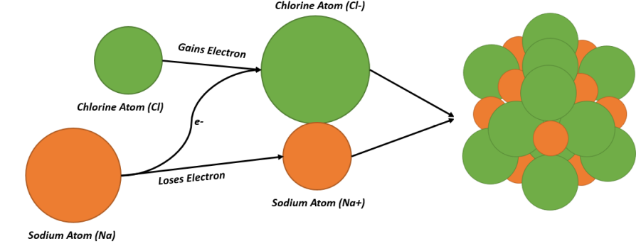 此外,离子化合物含有多个离子,这些离子通过称为离子键的静电力保持在一起。虽然这些化合物本质上是中性的,但它们由一些带负电荷和带正电荷的离子组成,分别称为阴离子和阳离子。组成离子的蒸发,沉淀或冷冻是生产离子化合物过程中的主要因素。当一个原子或一小群原子开始失去或获得电子时,离子化合物根据离子键和带电粒子形成。例如,氯化钠(也称为食盐)的形成下图所示。在电子转化过程中,钠(中性)在失去一个电子时变成钠阳离子(Na)。此外,Cl变成氯离子(Cl+−)当它获得电子时。因此,食盐是Na和Cl的固体聚集体。+−离子,由于相反的电荷而相互吸引。