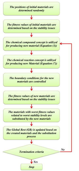 材料生成算法(Material Generation Algorithm,MGA)由Siamak Talatahari等人于2021年提出,该算法模拟了 材料生成过程(化合物,化学反应和化学稳定性),十分新颖,效果甚好。