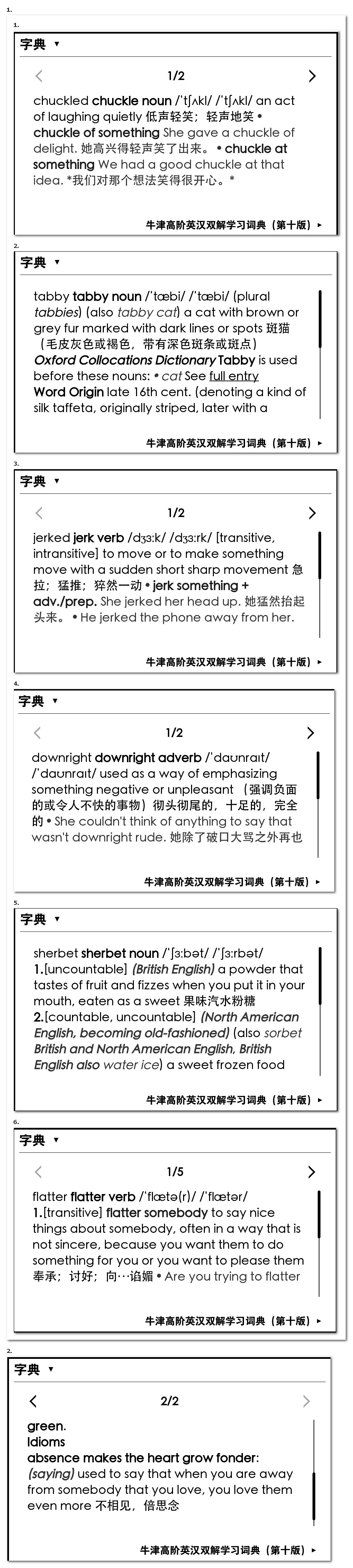 同时,为满足快速阅读人群的需要,也特地制作了一部精简版,保留词典主体部分(释义),删除了所有学习型内容,并进行适当紧凑化处理以方便速查速得。具体可见:[Kindle英汉词典] 牛津高阶英汉双解词典(第十版 · 精简版)(注:若购买了完整版,则附赠精简版,无需另行购买)