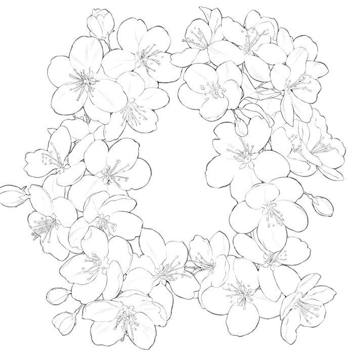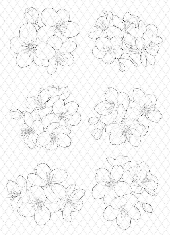 海棠花花朵线稿笔刷,可通过改变前景后景色来实现改变素材颜色(可做剪影),内含6款不同姿态的海棠花花团,十分适合营造花团锦簇的效果。笔刷内容尺寸足够、使用丝滑。