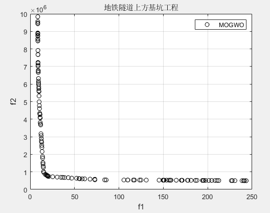 MOGWO求解隧道最大竖向位移和工程造价可变部分,分别是f1和f2。