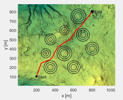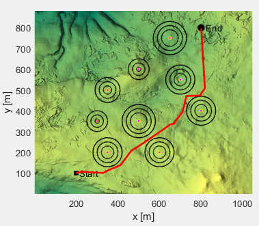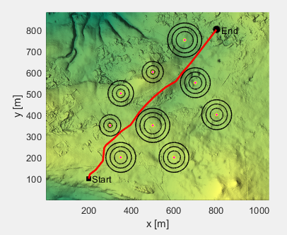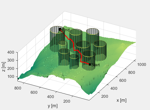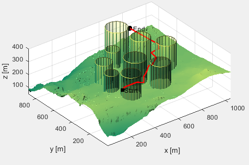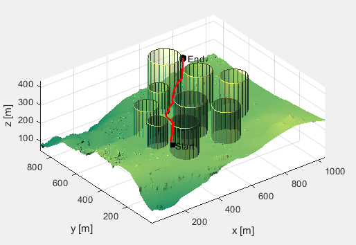 独立运行三次,得到三次参考方案如下:(黑色正方形是起点,黑色圆圈是终点,共有9个柱状障碍物,红线为优化得到的无人机路线。)