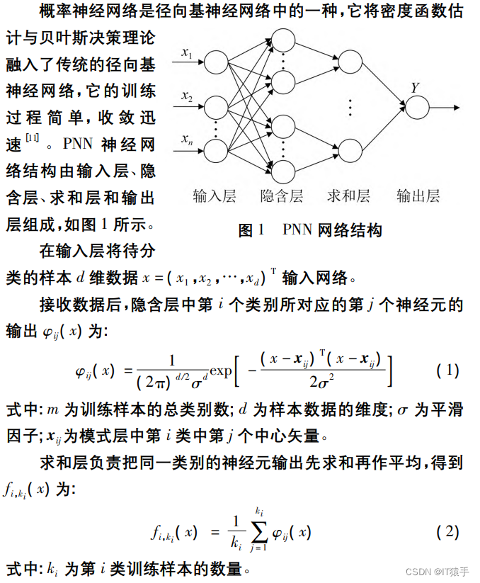 概率神经网络(Probabilistic Neural Network,PNN)是径向基网络的一个分支,属于前馈神经网络,是一种4层结构的概率型神经网络,包括输入层、隐含层、求和层和输出层。