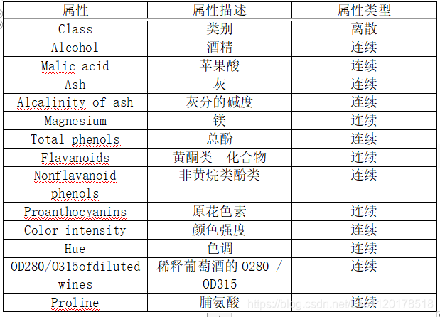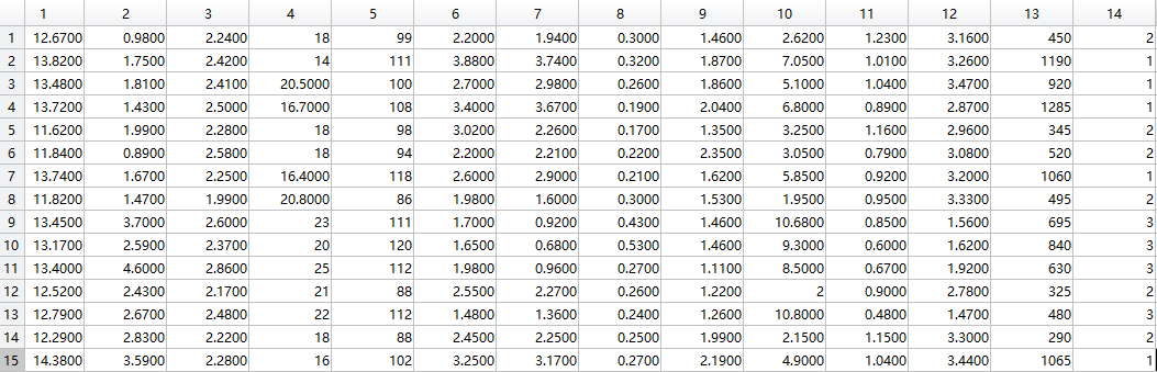 在wine数据集中,这些数据包括了三种酒中13种不同成分的数量。文件中,每行代表一种酒的样本,共有178个样本;一共有14列,其中,第一个属性是类标识符,分别是1/2/3来表示,代表葡萄酒的三个分类。后面的13列为每个样本的对应属性的样本值。剩余的13个属性是,酒精、苹果酸、灰、灰分的碱度、镁、总酚、黄酮类化合物、非黄烷类酚类、原花色素、颜色强度、色调、稀释葡萄酒的OD280/OD315、脯氨酸。其中第1类有59个样本,第2类有71个样本,第3类有48个样本。